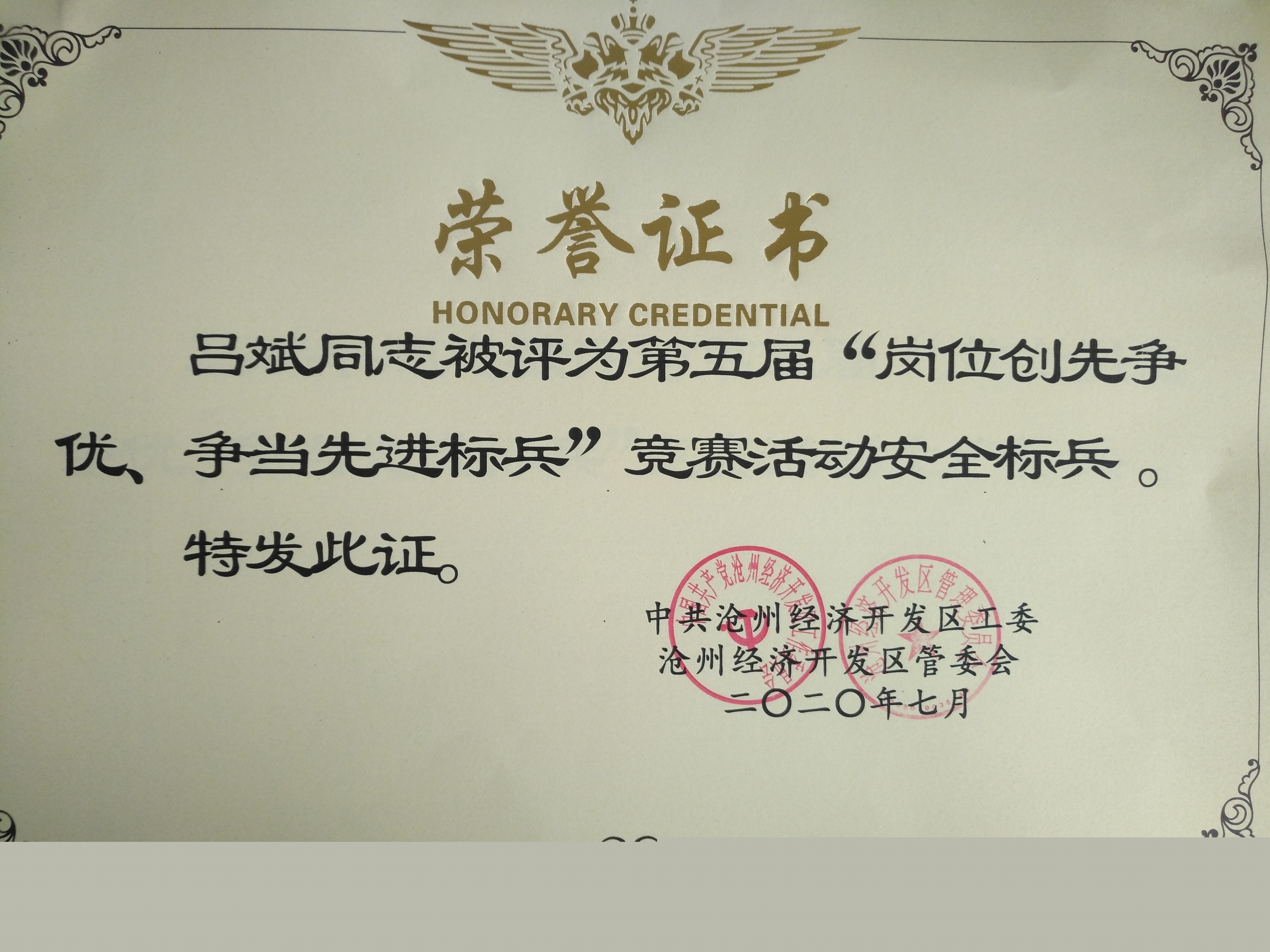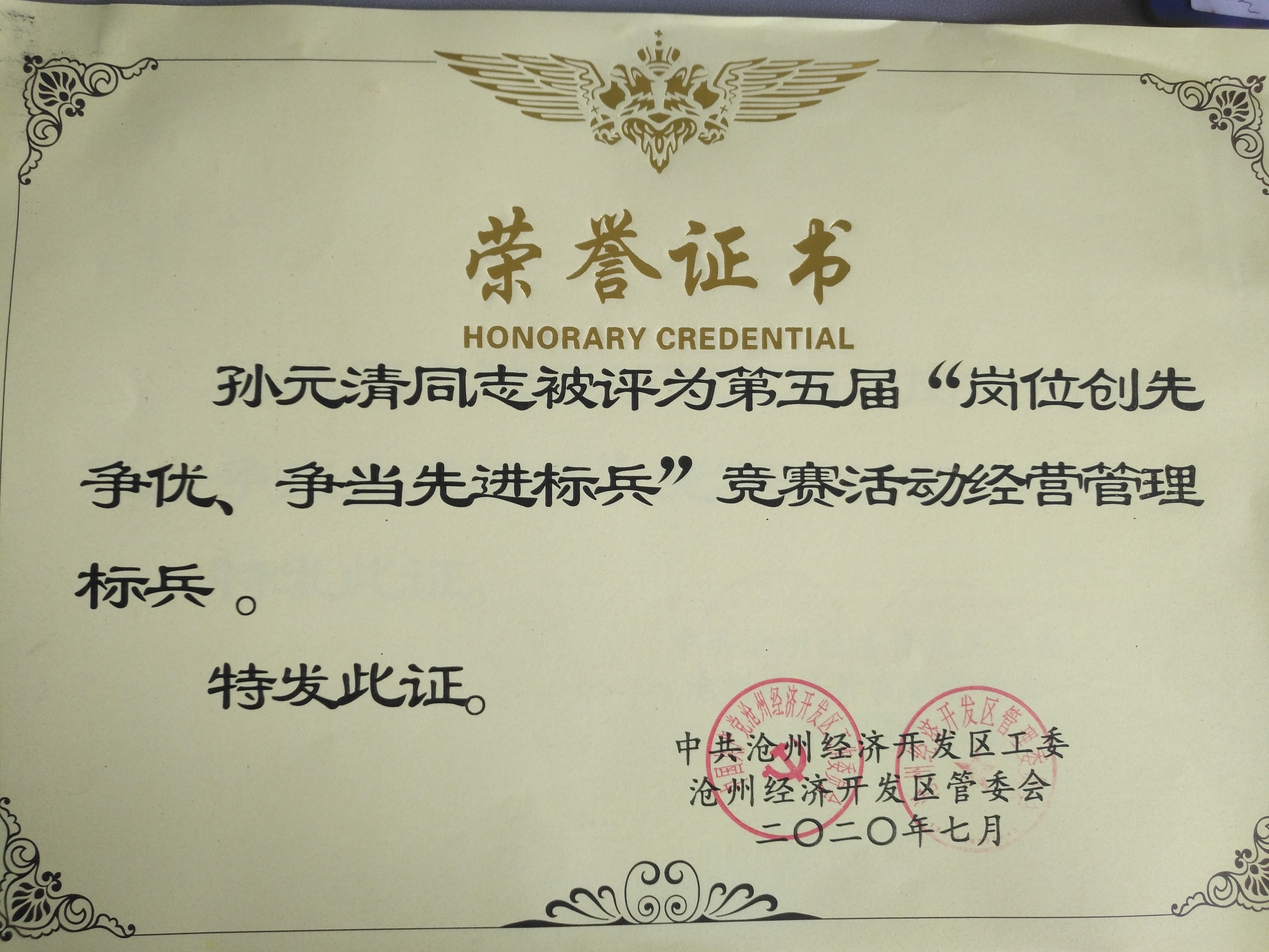 近日,滄州開發區企業委員會開展第五屆“崗位創先爭優、爭當先進標兵”競賽活動,公司總經理孫元清被授予經營管理標兵、綜合部部長呂斌被授予安全標兵榮譽稱號、設備部部長劉植梅被授予技術創新標兵榮譽稱號、原料藥車間馬鵬舉、輸液二車間丁傳彥被授予生產標兵榮譽稱號。此次評選表彰工作圍繞提高管理水平、保證安全生產、增加經濟效益、促進技術進步,以創一流管理、創優秀團隊、創最佳效益為目標,立足崗位創先爭優,開展爭當標兵競賽,引導全體黨員和全體員工以昂揚向上的精神風貌、更加出色的工作業績,體現黨組織戰斗力,展示黨員和先進員工風采,倡導塑造企業先進文化,帶領廣大群眾為企業和諧快速發展多做貢獻。
