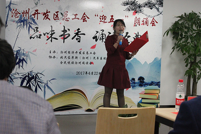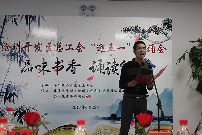 2017年4月22日,滄州開發(fā)區(qū)總工會主辦,北汽岱摩斯(滄州)汽車系統(tǒng)有限公司工會、全民悅讀滄州閱讀會協(xié)辦的“迎五一誦讀會”如期舉行。此次朗讀會主題為“品味書香,誦讀經典”,是為打造滄州東部新城,在開發(fā)區(qū)推廣全民閱讀的一次嘗試。我公司職工劉艷麗、鄭福貴分別在會上深情朗讀了詩歌《相信未來》、《希望,展翅飛翔》。
