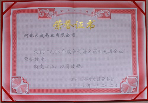 2014年榮獲“2013年度爭創著名商標先進企業”榮譽稱號